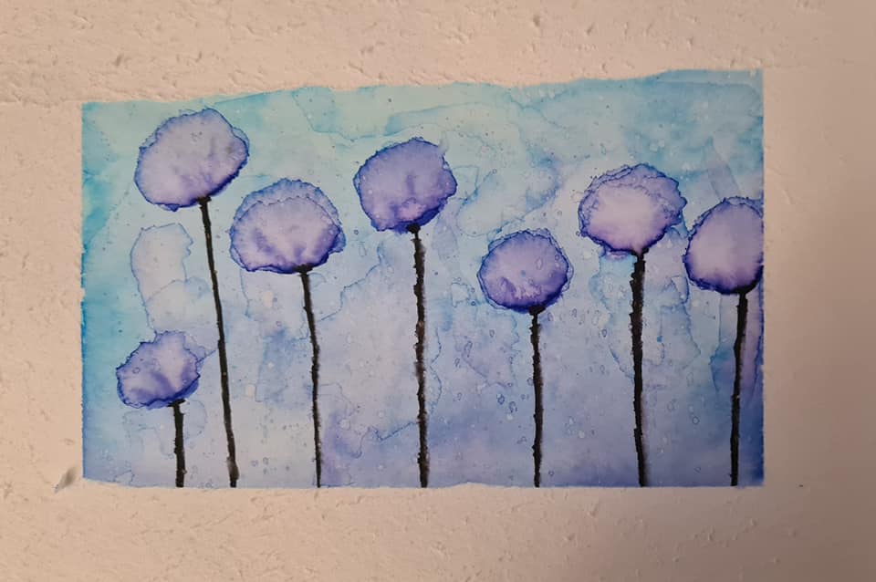 „Hast du das direkt auf Tapete gemalt?“, fragte mich meine Tochter. Nein, hab ich nicht. Auch das ist ein Bild vom ersten Tag und ich hatte das Aquarellpapier mit Malerkrepp abgeklebt, um ein Passepartout- Effekt zu kreieren. Leider klebte es dann so fest, dass die obere Schicht am Klebeband hängen geblieben ist. Jetzt sieht es also so aus, als hätte ich auf Raufasertapete gemalt :). Auch das ist ein erster Versuch, der weit von der Vorlage aus dem Kurs entfernt ist. Es ist mit drei verschiedenen Blautönen gemalt und durch den Wasserstift kommen die unterschiedlichen Farbnuoncen schön zur Geltung. Allerding kann ich an diesem Bild auch gut erkennen, dass man schnell sein muss, weil sich sonst sofort Ränder bilden, die man dann irgendwann auch nicht mehr vermalen kann.