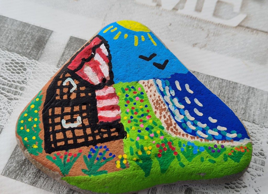 Ich hatte mir ja vorgenommen, im Urlaub wieder einmal ein paar Steine zu bemalen. In der Kreativgruppe von Schnaud.de auf Facebook gibt es jede Woche ein neues Thema. In alphabetischer Reihenfolge werden verschiedene Themen vorgeschlagen. Das ist dann quasi die wöchentliche Challange. Letzte Woche war es S wie Strandkorb. Perspektivisch eine Katastrophe…aber immerhin….Aufgabe erfüllt. Im Aquarell will ich dass dann mal besser machen.