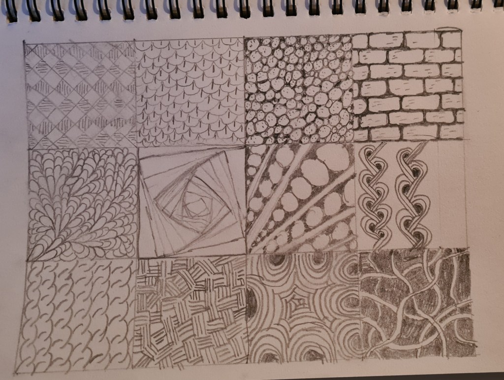 Der neue Malkurs ist anders aufgebaut, als ich es erwartet habe. Schon ihn anzuschauen, ist etwas anderes. Ein spanisch sprechender Lehrer und deutscher Untertitel. Manche Passagen muss man sich doppelt anschauen und manchmal ist es erforderlich, erst das ganze Video zu schauen bevor man in die Aktion geht. Bei dieser Übung habe ich es immer wieder angehalten und erst das Muster gemalt, bevor ich zum nächsten übergegangen bin. An das Spanisch habe ich mittlerweile gewöhnt. Wer weiß, vielleicht lerne ich ja auf diesem Weg sogar eine neue Sprache. Lach….nein, wohl eher nicht. Aber es klingt witzig und manche Wörter kennt man ja schon 🙂