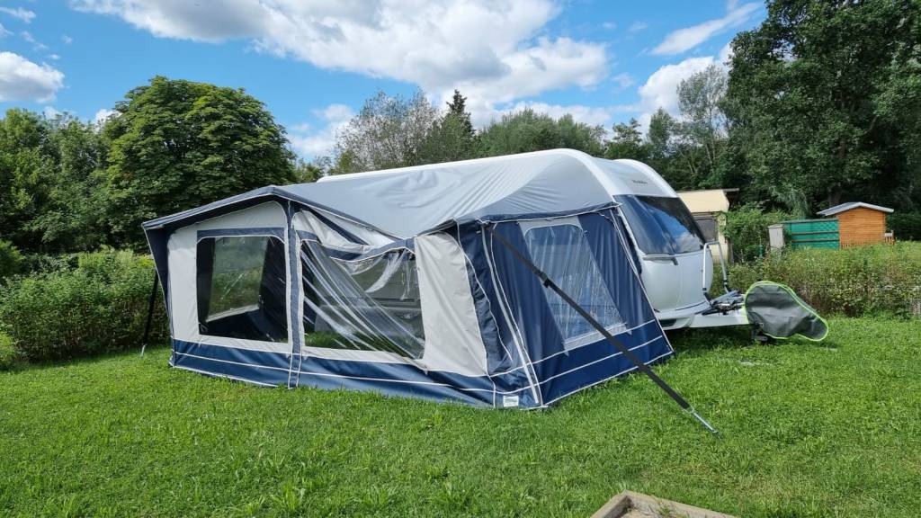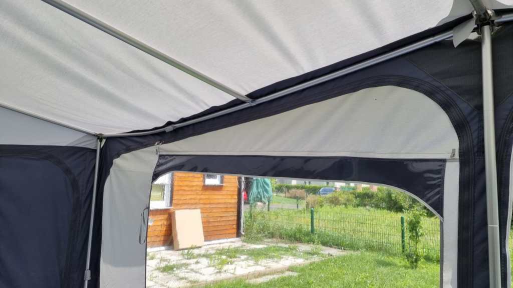 Es hatte sich jede Menge Wasser auf dem Dach des Vorzeltes gesammelt. Keiner von uns war auf die Idee gekommen, am Montag nach dem Rechten zu sehen. Und so hat die Wasserlast das Gestänge verbogen. Mein Mann musste es irgendwie alleine richten, da ich ja nicht da war. Was soll ich sagen….hinterher sah es so aus, als wäre nie etwas gewesen.