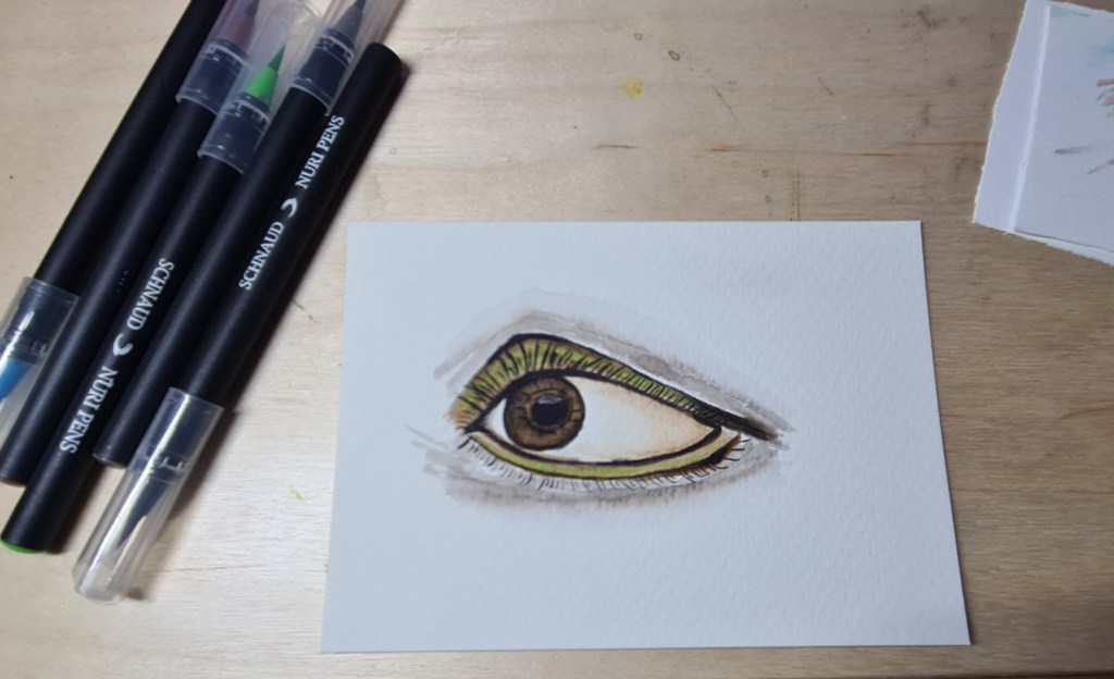 Man sagt, Augen seien schwer zu malen. Ich kann das nur bestätigen. Mein Reverenzbild hatte eigentlich blaue Augen. Aber da ich selber sehr dunkle, braune Augen habe, bin ich wohl etwas abgekommen. Egal. Hier also mein erstes, mit Aquarell gemaltes Auge. Ich bin tatsächlich schwer stolz auf mich, dass es mir dann doch gleich schon so gut gelungen ist. Diese Übung hatte ich schon lange im Kopf. Es scheint sich gelohnt zu haben, solange damit zu warten, bis ich bereit war.