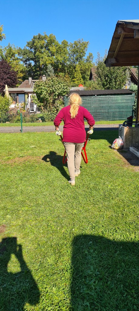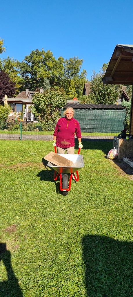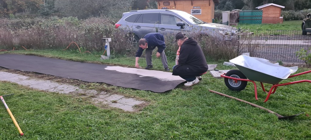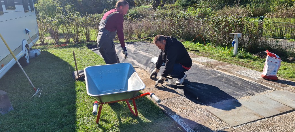 Naja….nicht alles. Aber der „Radweg“ für unseren Wohnwagen, den haben wir am letzten Wochenende in Angriff genommen. Die Platten, die da lagen, waren fast alle gebrochen. Und der Abstand zwischen den beiden Reihen passte zwar für ein Wohnmobil, aber eben nicht für unseren Wohnwagen.