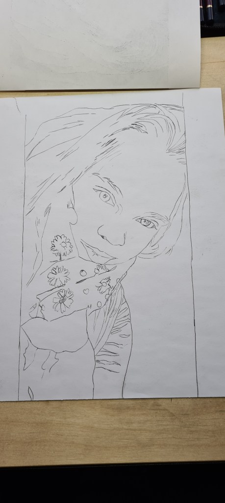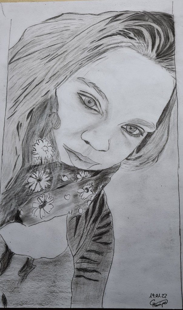 Meine Schwiegertochter hatte mich gebeten, ein Bild von ihr zu zeichnen und mir ein Foto geschickt. Weil ich etwas Zeit sparen möchte, habe ich mir Kohlepapier besorgt um die Umrisse und markanten Punkte abzupausen. Ungeduldig, wie ich nun mal bin, habe ich nicht vorher ausprobiert, wie das mit dem gekauften Papier am besten funktioniert sondern gleich losgelegt. Das Ergebnis war toll, bis auf einen winzigen Fehler….es lässt sich nicht radieren. Demzufolge ließen sich die Konturen nicht in die Schattierungen verstecken. Trotzdem hat das Bild was und da es meiner Schwiegertochter sehr gut gefällt, bekommt sie jetzt zwei. Denn natürlich habe ich mich nochmal dran gesetzt. Diesmal aber wieder mit einschwärzen von Hand. Sicher ist Sicher 🙂